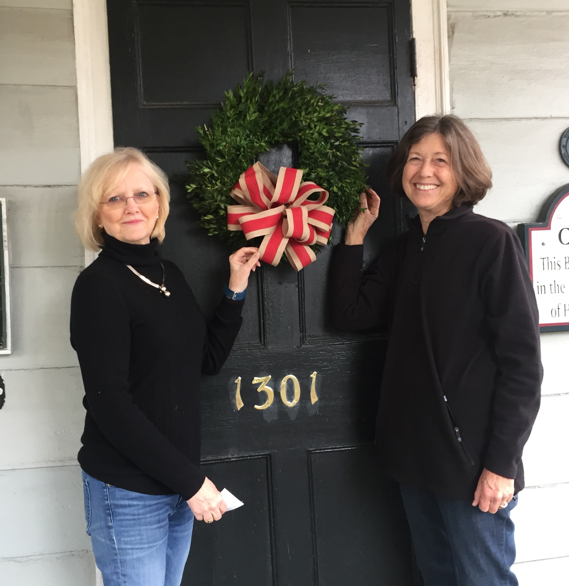 Karen Kalutz and Pam Schreiner hanging this year's Christmas wreath.