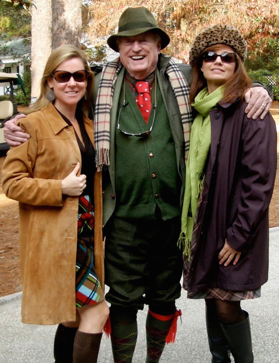 Reid Buckley pre-Christmas lunch, wearing breeks with holiday red furbelows, flanked by May DeLoach and Jenny Maxwell.