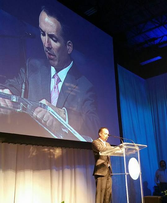 Speaking on a stage before a large audience, Ritch pauses to grab a selfie.