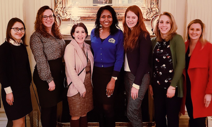 Buckley Executive Seminar students posing for a group photo in front of the fireplace in the Holly Hedge ballroom..