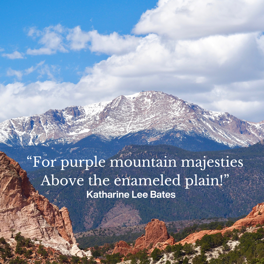 Katharine Lee Bates, a poet and English professor at Wellesely College, made her way by train to Colorado in 1893. On a July day, she headed to Pike's Peak, where the lines of her poem "America" began to form in her head. It was published two years later, and by 1900 some 75 different melodies had been written to make her poem a song.