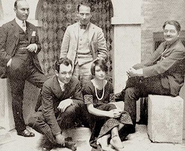 Dorothy Parker in 1919 with Algonquin Round Table members and guests (l–r) Art Samuels, Charles MacArthur, Harpo Marx, and Alexander Woollcott.