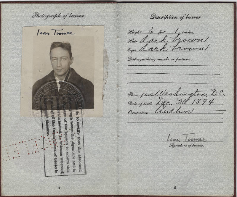 Toomer's passport from 1926, with a photo taken not long after "Cane" was published.
