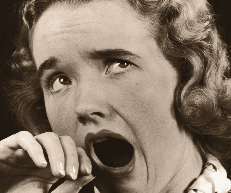 She was struggling with a yawn. She resisted, but the corners of her mouth were as though tugged away from her pretty little teeth by iron grapples. She could not suppress the eruption, which was prodigious. It tripled the cubic volume of her mouth, and it came forth loudly, like sixty pounds of air pressure escaping an inner tube of a tractor’s tire.