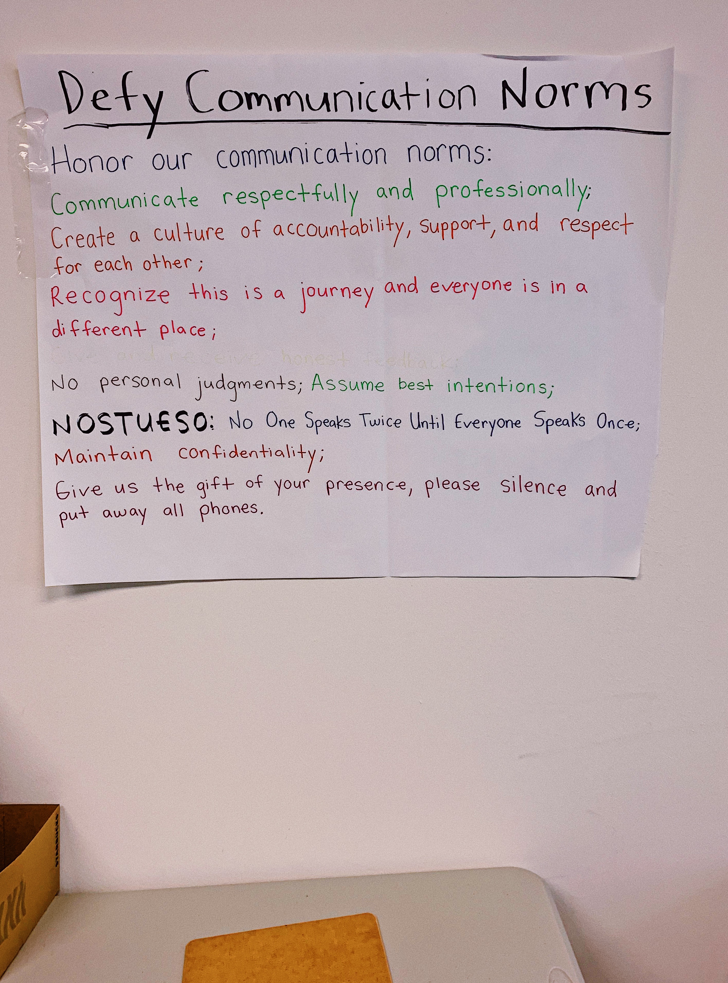 Defy members generated their own guidelines for communicating, posted on our classroom wall.