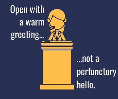 If the speaker needs to smile when she greets the audience, help her craft an open that is more than a perfunctory “I’m happy to be here.”