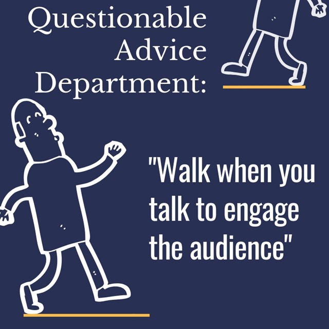Other speakers say it’s essential to walk around the stage—and into the audience. They’ve seen other speakers do it. They believe it conveys energy. They think it improves the speaker’s connection to the audience.