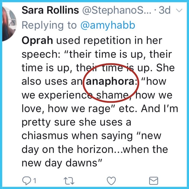 Even when we’re not aware of it, we’re using many of the same rhetorical techniques Aristotle, Cicero, Abraham Lincoln, Frederick Douglass, Winston Churchill, Martin Luther King, Jr. and other greats have employed in public speaking. Each month, our Buckley School resident students of classical rhetoric explain a rhetorical device that can improve your public speaking. (Tweet about Oprah Winfrey's recent speech, above, by @StephanoScripo)