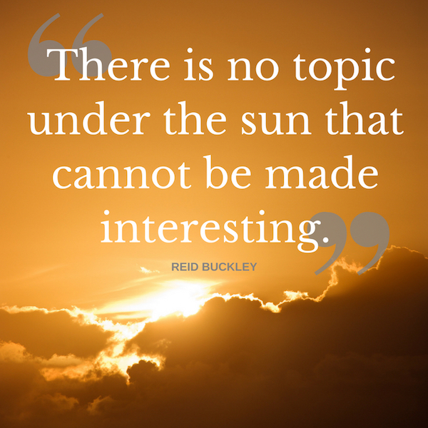 Stop feeling sorry for yourself. There is no topic under the sun that cannot be made interesting. Some topics just demand more effort on the speaker’s part.