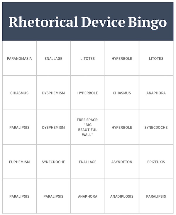 Here's a PDF you can print (go to page 3), if you care to play along. And if you want to scroll through our articles about the various rhetorical devices on the card, this link will help you do that.