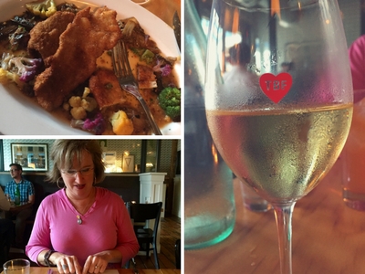 Elise studies the menu, Jenny orders Scandinavian influenced fried pork leg, and there was wine.