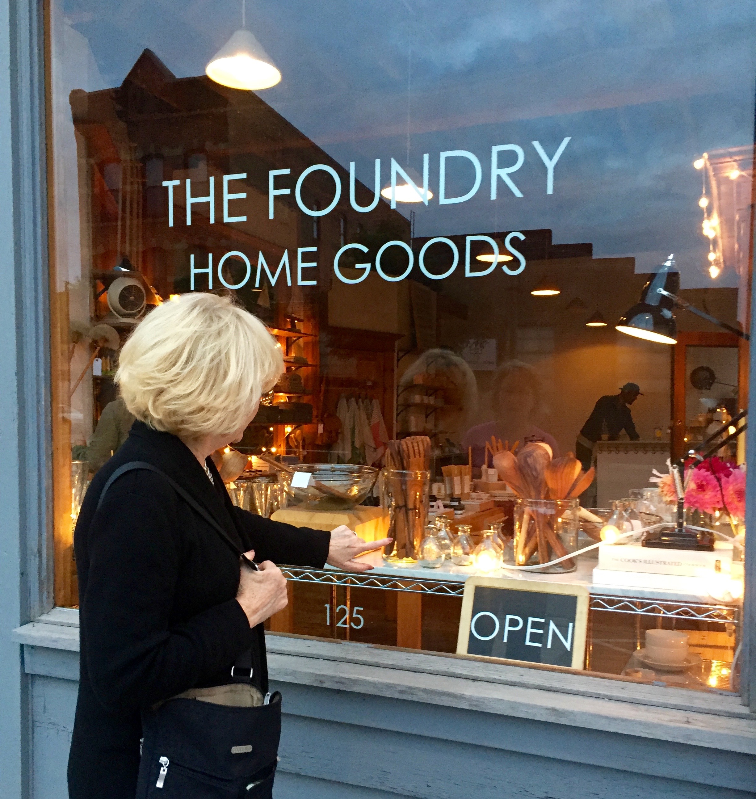 Karen checking out a North Loop shop. After our meal, we were happy to have a walk home.